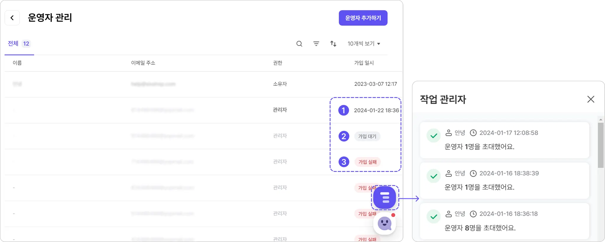 ① 가입 완료 | 운영자 목록에 가입 일시가 노출 |