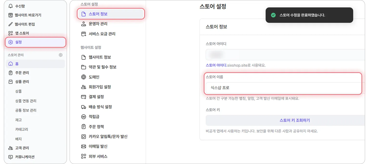 식스샵 프로 계정에 로그인 후, 먼저 [설정 > 스토어 정보]의 스토어 이름을 점검해 주세요.