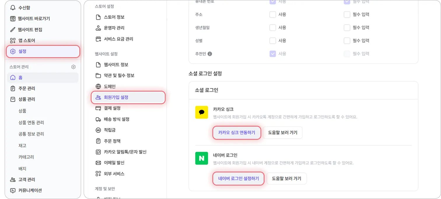 [설정 > 회원 가입 설정]의 소셜 로그인 설정에서 카카오/네이버 로그인을 5분 이내 간편하게 연동할 수 있어요.