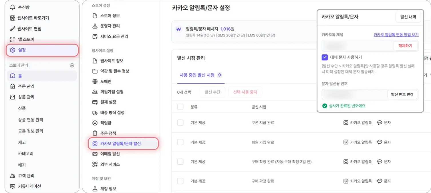[설정 > 카카오 알림톡/문자 발신]에서 카카오톡 채널이나 발신번호를 등록하고, 원하는 발신 시점을 사용 설정하면 알림톡/문자를 받아 볼 수 있어요. (건당 유료)