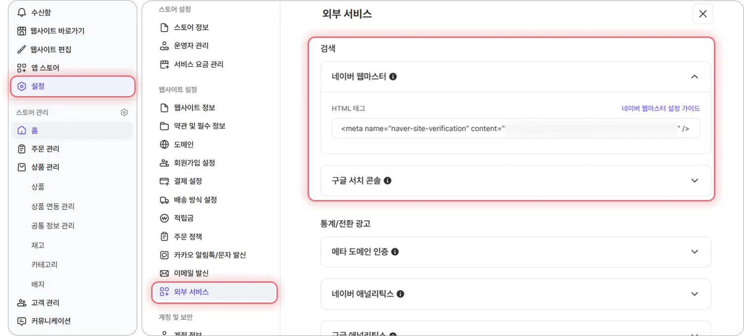 [설정 > 외부 서비스]에서 네이버 웹마스터/구글 서치 콘솔 항목에 HTML 태그 값을 입력해 두면 약 2-4주 이내 사이트가 검색 엔진에 노출됩니다.