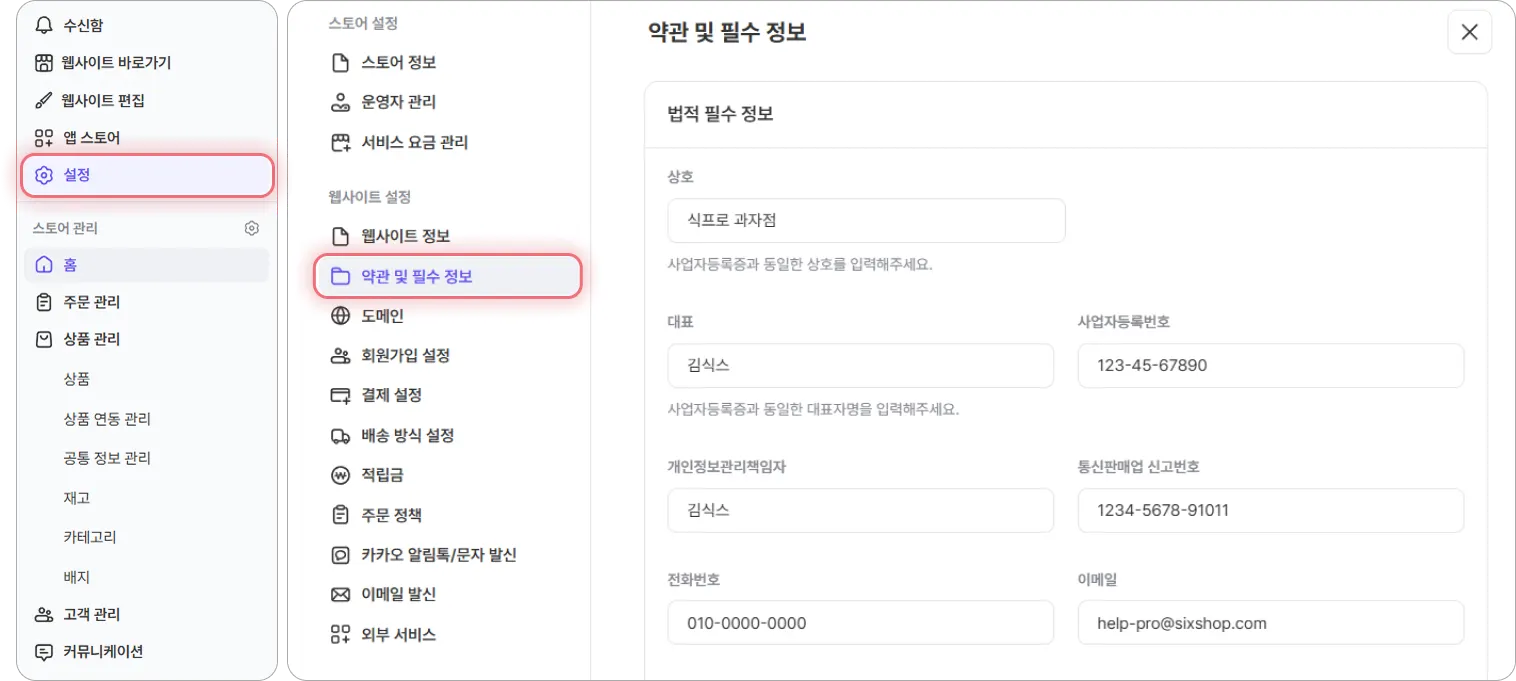 [설정 > 약관 및 필수 정보]에서 PG 심사 항목인 법적 필수 정보와 약관을 빠르게 등록합니다.