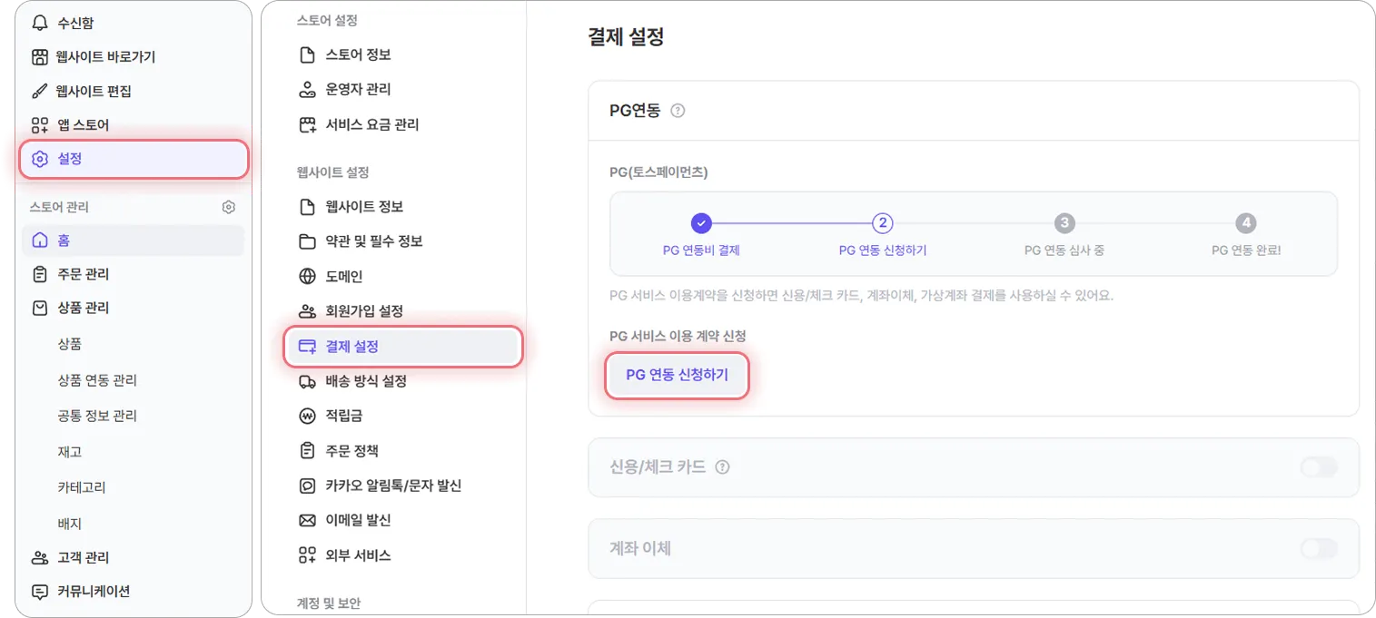 [설정 > 결제 설정]에서 [PG 연동 신청하기] 버튼으로 간편하게 신청할 수 있어요. 신청만 하셔도 6분 만에 일시불 카드 결제가 오픈됩니다! (미리 오픈)