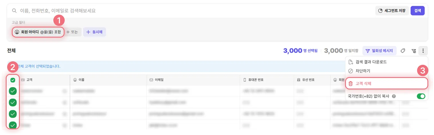 [채널톡 > 고객 연락처]에서 ‘회원 아이디에 @가 포함된’ 고객 필터링 후 전체 삭제