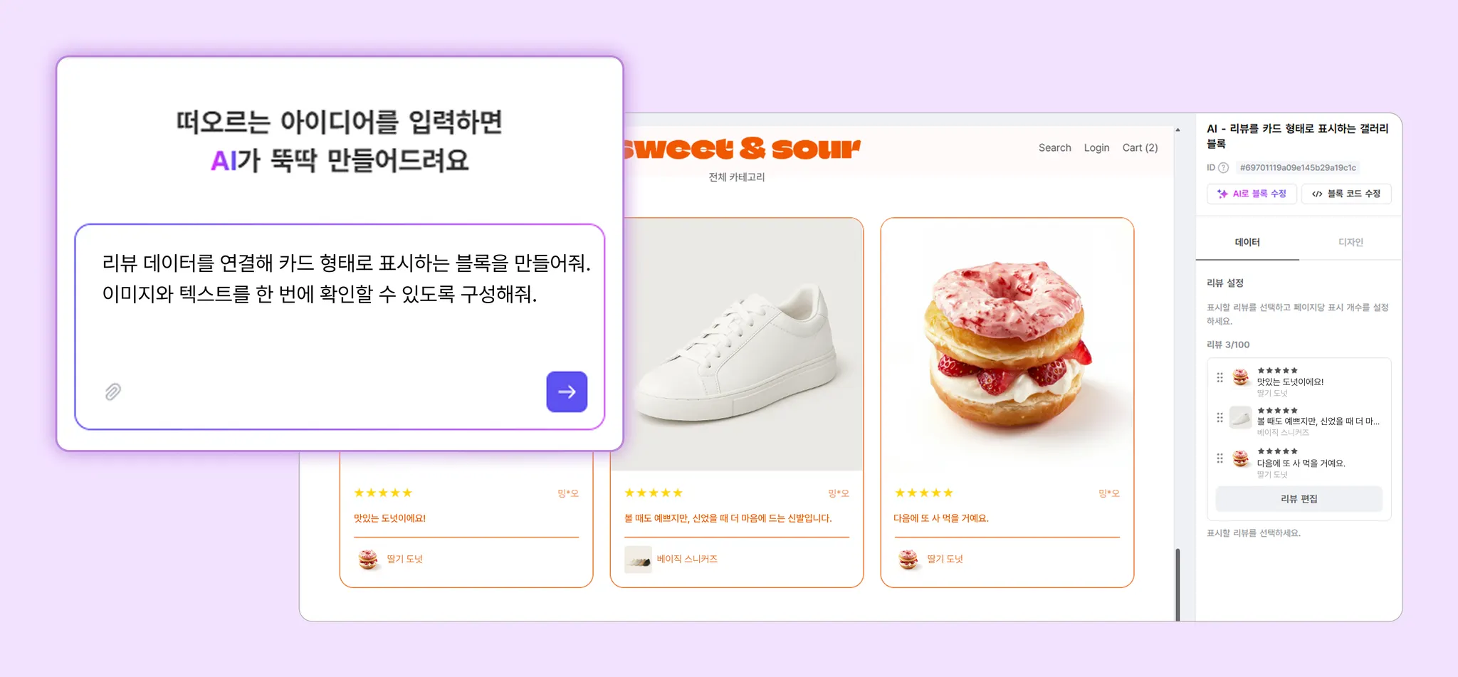 AI 블록 생성을 통해 리뷰 데이터를 연결한 블록도 만들 수 있어요.