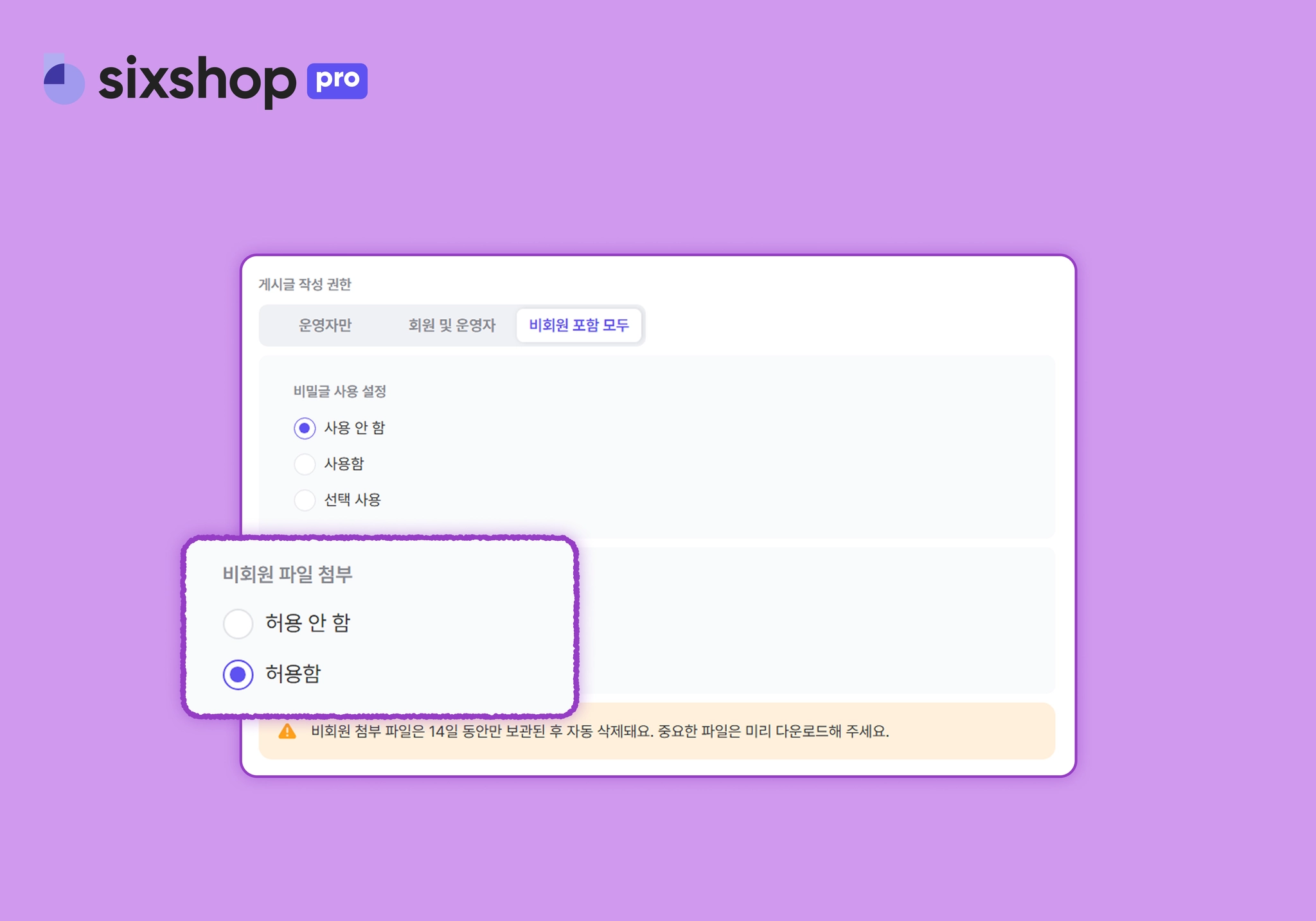 [관리 홈 > 커뮤니케이션 > 게시판]에서 비회원 파일 첨부 여부를 선택할 수 있어요.