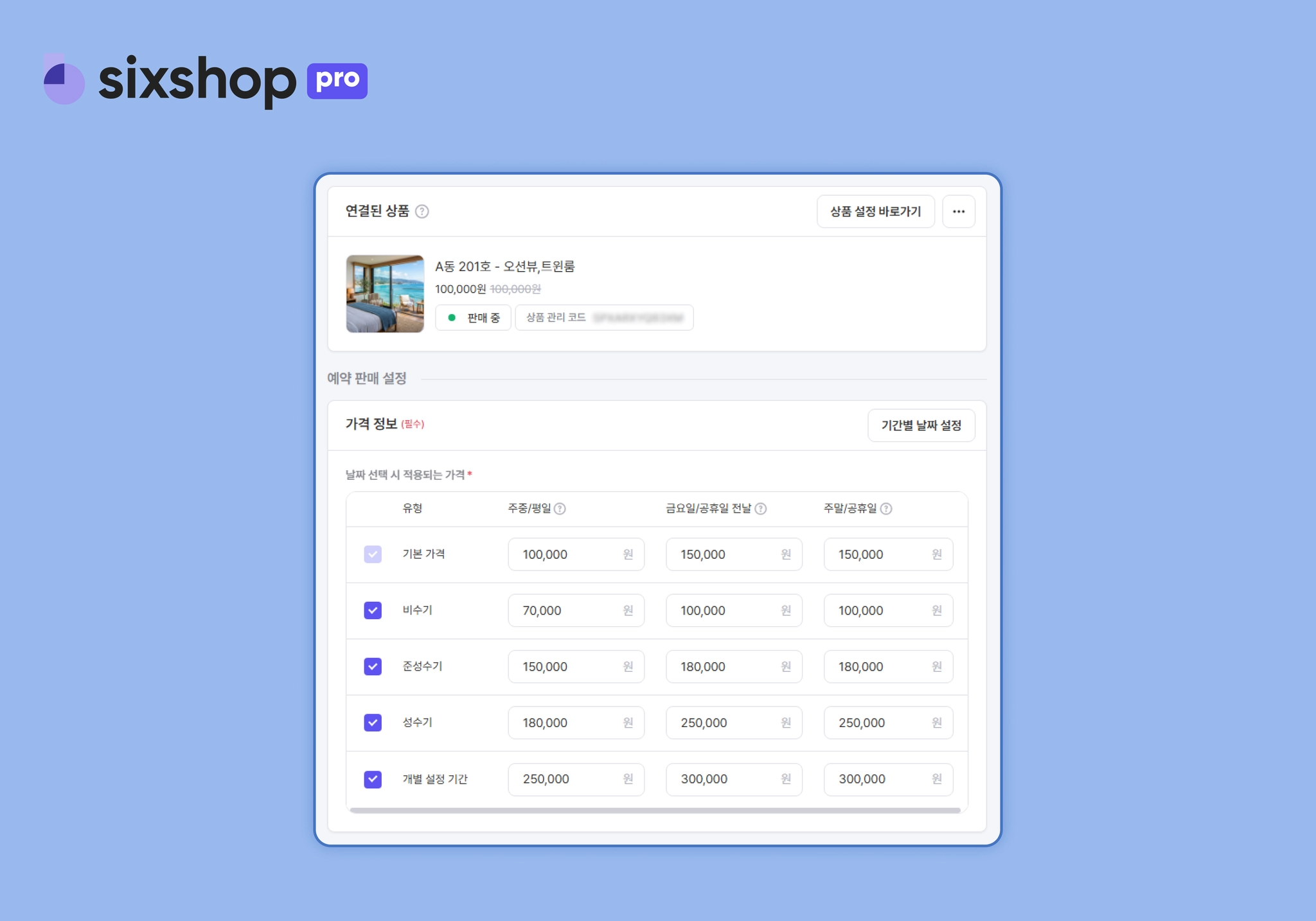 숙박형 상품 설정 기능을 통해 미리 준비한 시즌별, 기간별 스마트한 가격들도